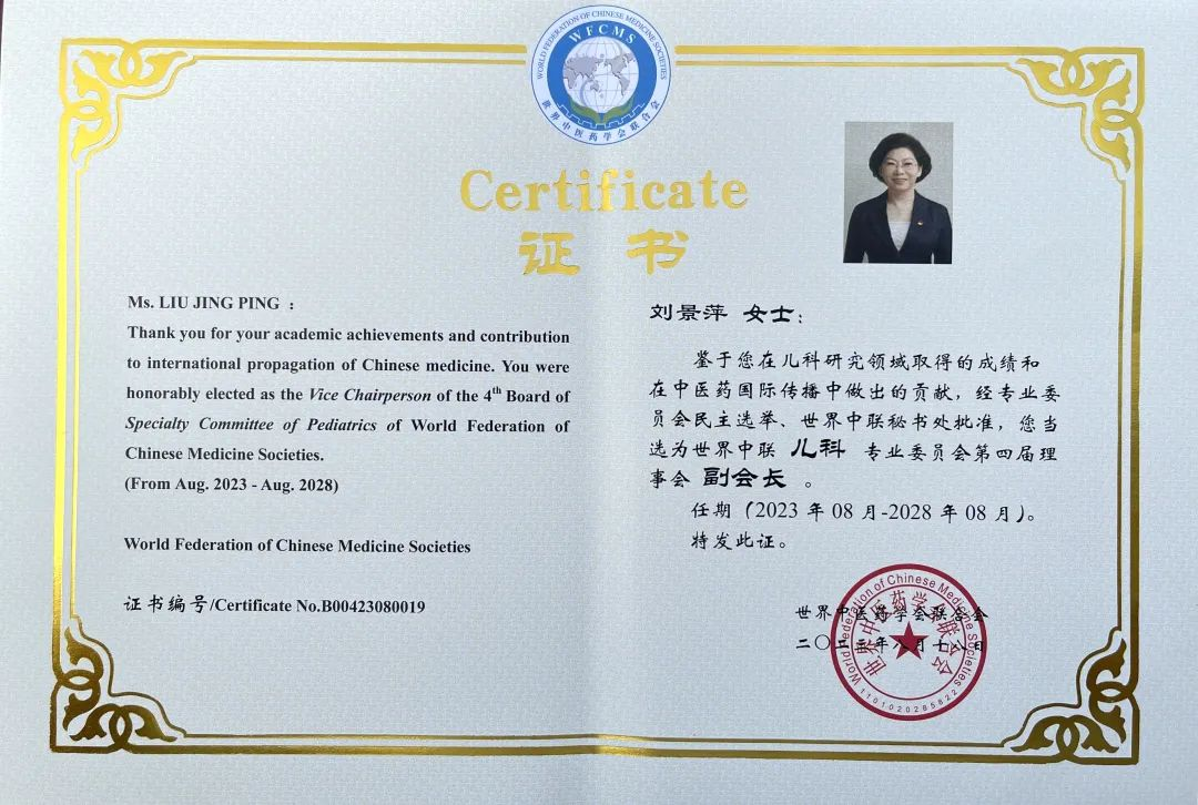 森林舞会药业集团党委书记、董事长刘景萍当选世界中医药学会联合会儿科专业委员会第四届理事会副会长